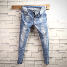 夏季时髦磨烂裤脚牛仔裤九分裤男 猫须割破修身小脚磨白9分裤男潮