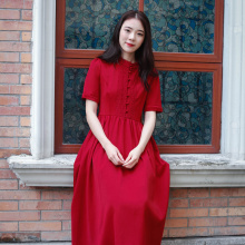 筱艾 文艺复古立领蕾丝雪纺短袖连衣裙 夏季大摆修身高腰红色长裙
