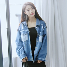 2016秋装新款BF风蓝色黑色宽松破洞口袋牛仔短外套女夹克大码上衣