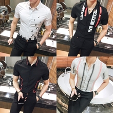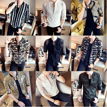 2017春夏新款男士韩版修身7分袖衬衫印花中袖衬衣发型师短袖寸衫
