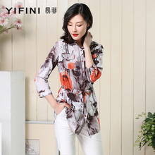 易菲2017春装新款时尚修身七分袖印花衬衫中长款蝴蝶结收腰衬衣女