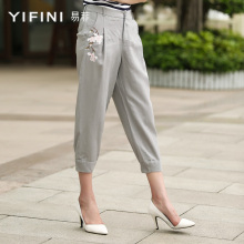 易菲2016夏装新款宽松休闲显瘦100%亚麻绣花哈伦裤小脚裤女七分裤