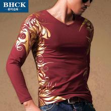 春秋装男士长袖T恤韩版修身V领印花打底衫青年休闲男装体恤潮流