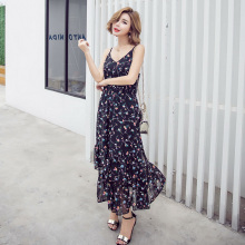 吊带连衣裙女2017夏季无袖小碎花V领复古港味雪纺中长款两件套裙
