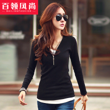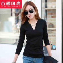 2017秋装新款韩版大V领设计纯棉修身大码长袖T恤打底衫女上衣潮