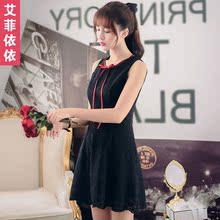 蝴蝶结蕾丝修身a字小黑裙女 新款韩版波浪边名媛气质背心连衣裙夏