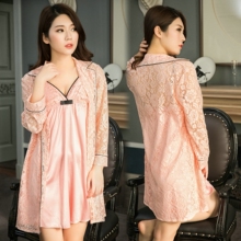 春季长袖性感睡衣女夏薄款网纱睡袍两件套蕾丝花边吊带睡裙家居服