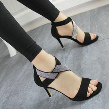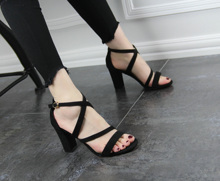 欧美2017夏季新款一字扣高跟鞋粗跟凉鞋罗马黑色百搭绒面露趾女鞋