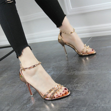 细跟高跟鞋夏季简约时尚金色细带一字扣带百搭铆钉凉鞋女