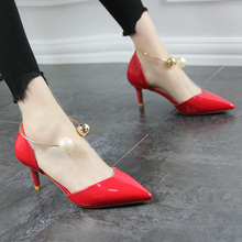 2017夏季新款尖头中跟高跟鞋女鞋中空珍珠细跟红色婚鞋女单鞋凉鞋