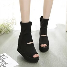 欧洲2017夏季新款厚底鱼嘴靴中筒靴松糕弹力布内增高坡跟短靴女鞋