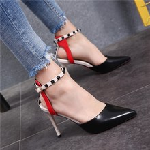 凉鞋女一字扣单鞋女细跟高跟鞋新品铆钉尖头黑色女时尚百搭女鞋潮
