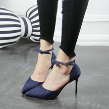 春秋2017新款凉鞋尖头高跟鞋牛仔绒面蝴蝶结一字扣高跟包头单鞋女