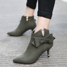 韩版2016冬季尖头绒面高跟绒面短靴蝴蝶结中跟女靴及踝靴细跟女靴