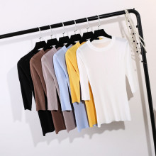冰丝春夏装新款女装中袖上衣修身半袖针织衫T恤女五分袖打底衫薄