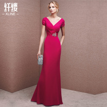 2017新款时尚V领长款枚红修身显瘦宴会晚礼服新娘敬酒服年会礼服
