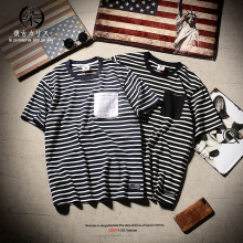 原创 夏季日系复古休闲条纹T恤短袖 刺绣小标原宿风潮牌半袖tee男