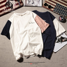 夏季 日系潮流休闲短袖tee 韩版原宿风情侣款拼色刺绣半袖T恤男女