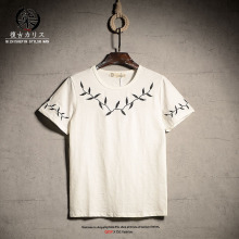 树叶刺绣 原创日系复古潮流休闲短袖T恤 韩版竹节棉修身半袖tee男