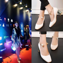 方头粗跟高跟鞋女2017春新款白色脚环珍珠单鞋韩版百搭一字扣女鞋