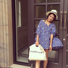 superjoy 韩国新款碎花印花棉麻短袖连衣裙娃娃裙系带荷叶边