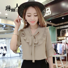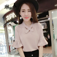 琳丽人雪纺衫短袖2017夏新款雪纺上衣宽松显瘦喇叭袖蝴蝶结小衫潮