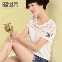 熙世界2017夏装新品圆领蝴蝶印花镂空蕾丝刺绣短袖T恤女102ST004