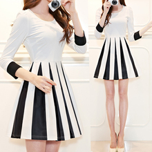 2016韩版春装新款女装套头黑白条纹印花连衣裙