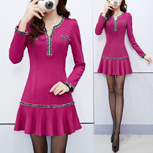 2016秋季韩版女V领大红色大摆短裙 长袖修身显瘦收腰连衣裙