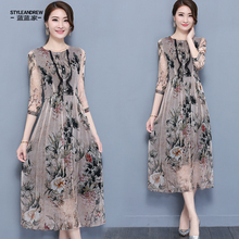 印花连衣裙长裙2017夏新款韩版百褶雪纺圆领显瘦七分袖大摆裙潮