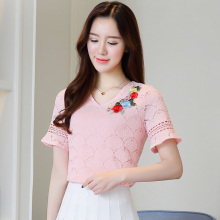 喇叭袖上衣2017夏装新款韩版女装V领雪纺镂空修身白色短袖蕾丝衫