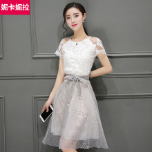 2017夏季新款蕾丝连衣裙子套装中长款a字裙女欧根纱蓬蓬裙两件套