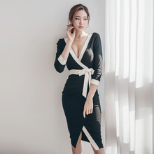 性感连衣裙春装2017新款韩版女装V领修身七分袖中长款开叉包臀裙