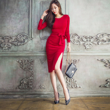 2016秋装新款韩版女装修身时尚中长款开叉长袖包臀打底连衣裙潮