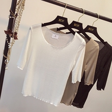 2016韩版女五分袖冰丝t恤夏季修身显瘦纯色圆领中袖针织打底衫薄