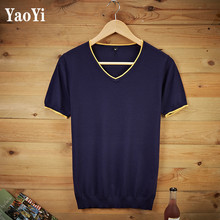夏季短袖t恤针织衫v领青年半袖清凉修身时尚纯色韩版体恤男士冰丝