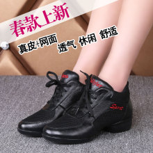 莎兰娜秋季广场舞蹈鞋真皮网面透气软底增高现代跳舞鞋女中跟爵士