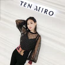 夜店性感女装2017新款T恤打底衫刺毛球钩花黑色透视网纱衫上衣潮