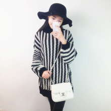 2015秋冬欧美走秀黑白波浪条纹高领灯笼袖宽松加厚羊毛针织毛衣女