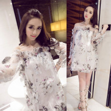 春夏夜店甜美女装2017新款性感一字领露肩花色包臀长袖大码连衣裙