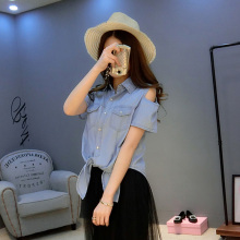 纯棉牛仔无袖上衣女夏韩版短款翻领修身收腰衬衣系带下摆打结衬衫