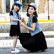 亲子装春夏装2016新款母女装连衣裙两件套装中大童女童装牛仔套装