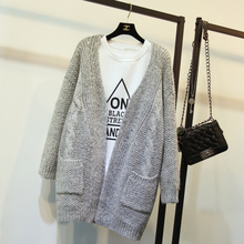 2015学院风秋冬新款中长款毛线开衫女韩版宽松口袋毛衣外套百搭