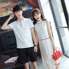 情侣装夏装2017新款韩范短袖蕾丝中长款连衣裙女百搭POLO领T恤衫