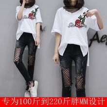 大码女装胖mm夏装2017新款破洞牛仔裤+短袖T恤胖妹妹时尚两件套装