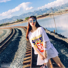 2017春装韩版破洞宽松大码短袖中长款竹节棉T恤前短后长打底衫女