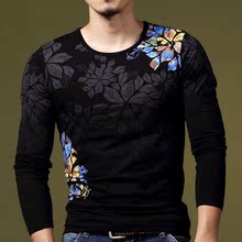 春夏玫瑰印花长袖t恤 修身圆领纯棉体恤 潮流男装衣服男小衫