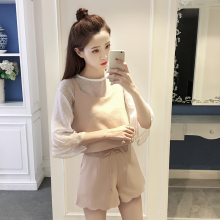 2017夏季款女装名媛小香风时尚显瘦棉麻蕾丝衫短裤两件套套装