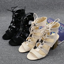 美国单 外贸气质高跟绑带潮鞋铆钉露趾罗马凉鞋粗跟时尚性感女鞋