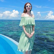 泰国海边度假一字领露肩沙滩裙仙女海滩裙连衣裙中长款显瘦夏